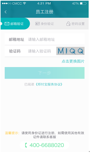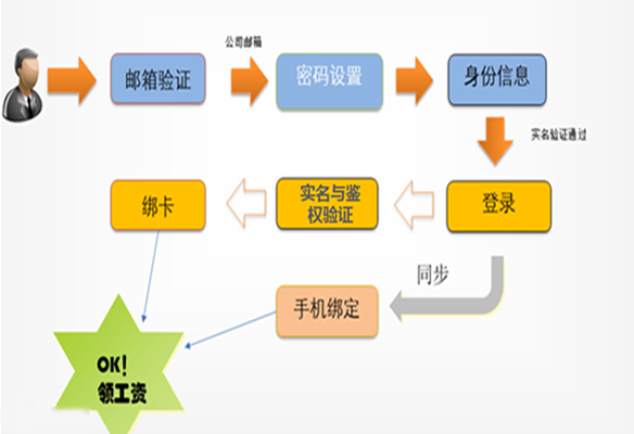 5.1注册完成后,新员工需要进行实名验证及绑定发薪银行卡。员工可以使用工号或邮箱登陆