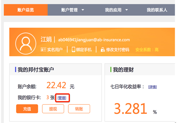 5.2绑卡—用户登录后在首页点击银行卡的“管理”按钮,进入银行卡列表页面。
