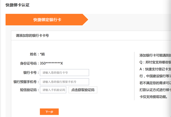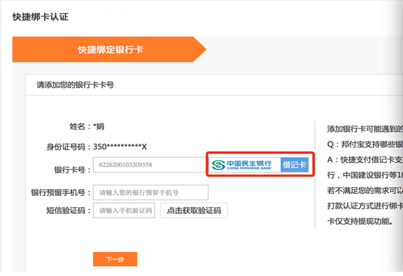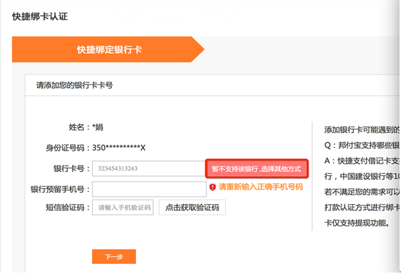 5.4用户输入银行卡号、银行预留手机号和短信验证码后,点击“下一步”。