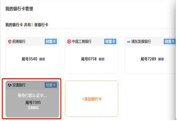 5.10用户需重新进入我的银行卡管理,此时会看到新增的置灰银行卡,显示“等待打款认证中”,点击“立即验证”按钮进入。