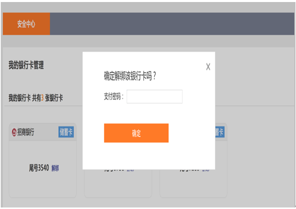6.1在银行卡选项卡上点击“解绑”按钮,解绑银行卡时需验证支付密码,通过后即可删除此银行卡。