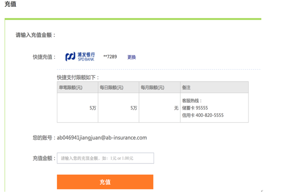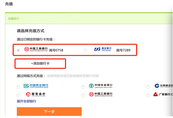 7.1从首页点击“充值”按钮进入账户充值页面;选择充值使用的银行卡(打款认证绑定的银行卡不允许充值),点击下一步。